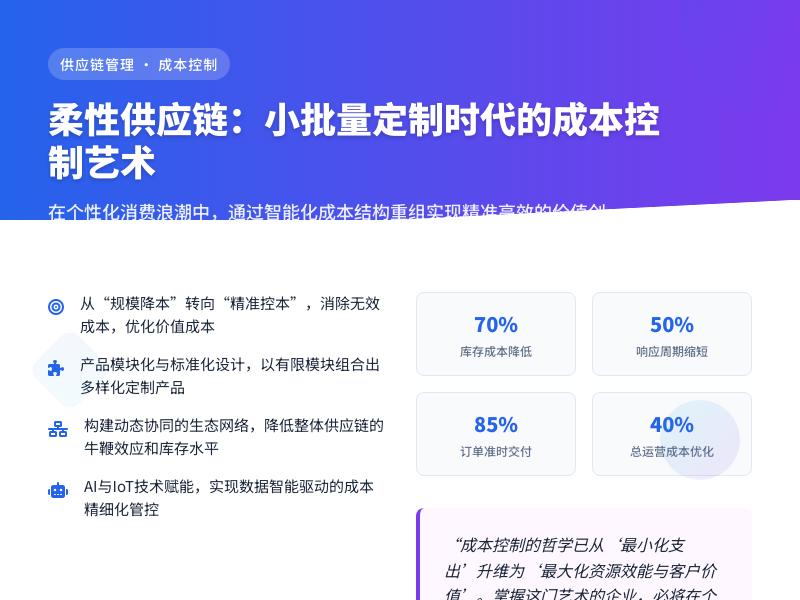 柔性供应链中的多源采购与协同管理教程:一人公司的AI赋能新范式 在当今瞬息万变的市场环境中,供应链的“柔性”已成为企业,尤其是规模小、资源有限的一人公司生存与发展的关键。传统供应链模式往往因僵化、响应迟缓而难以适应小批量、多批次、快节奏的市场需求。柔性供应链的核心在于其敏捷性、适应性和韧性,而多源采购与协同管理正是构建这种柔性的两大支柱。对于一人公司而言,如何高效实践这两大理念,曾是一个巨大的挑战。如今,以漳州柔性供应链服务有限公司(以下简称“漳州柔性”)为代表的创新服务商,正通过前沿的AI技术服务产品,为一人公司提供了一套切实可行的智能化解决方案,将挑战转化为独特的竞争优势。 一、 一人公司的供应链困境与柔性破局点 一人公司,顾名思义,创始人常身兼数职,在采购、库存、物流、客户管理等环节疲于奔命。其供应链痛点尤为突出: 采购端:过度依赖单一供应商,风险集中;寻找和验证新供应商耗时耗力;议价能力弱,成本控制难。 协同端:内部流程(订单、库存、销售)依赖人工同步,易出错、效率低;与外部供应商、物流商信息不通畅,可视性差,响应滞后。 决策端:缺乏数据支撑,采购计划、库存水位多凭经验,难以精准匹配市场需求波动。 柔性供应链理念为破局指明了方向:通过多源采购分散风险、优化成本、保障供应稳定性;通过内外部协同管理提升效率、增强透明度、实现快速响应。然而,实现这一切所需的信息处理、数据分析与实时协同能力,恰恰是一人公司最匮乏的。漳州柔性供应链服务有限公司的AI技术产品,正是为此量身定制的“外脑”与“连接器”。 二、 AI赋能的多源采购:从“人找货”到“智选源” 漳州柔性的AI采购引擎,为一人公司重构了智能化的寻源与决策流程。 智能供应商发现与评估: 全景扫描:AI系统通过网络爬虫、行业数据库及平台对接,7x24小时不间断地扫描海量潜在供应商,覆盖范围远超个人精力所及。 动态画像与评级:基于公开数据、交易记录、舆情信息等,AI自动为供应商构建动态画像,从价格、质量、交货准时率、服务水平、风险指数(如经营状况、地理位置风险)等多个维度进行量化评分与评级。一人公司创始人可快速锁定符合要求的优质备选源。 需求分析与智能推荐: 系统能学习分析公司的历史采购数据、销售预测及库存情况。 当有采购需求时,AI不仅能根据成本、交期等约束条件推荐最优供应商,更能进行智能组合推荐:例如,核心部件推荐高可靠性的主力供应商,通用件推荐高性价比的备用供应商,实现成本与风险的平衡。 风险预警与自动切换: AI实时监控供应商端的风险信号,如突发舆情、自然灾害、端口物流拥堵等。 一旦识别到高风险,系统会立即预警,并自动启动备用采购方案,或推荐可替代的供应商,实现采购源的动态弹性调整,极大增强供应链韧性。 三、 AI驱动的协同管理:从“信息孤岛”到“一体联动” 漳州柔性的协同管理平台,利用AI作为中枢神经,打通一人公司内外部的信息流与业务流。 内部流程自动化协同: 订单-库存-采购自动触发:平台对接电商店铺、ERP等系统。当销售订单生成,AI自动检查库存,低于安全库存时,自动生成采购建议甚至采购单,经创始人一键确认即可发出,实现“销售驱动”的精准补货。 智能库存管理:AI根据历史销量、季节性、促销计划等因素,动态计算并推荐最优安全库存水平,避免积压和断货。 外部生态实时可视化协同: 供应商协同门户:供应商可通过门户实时接收订单、更新生产/发货状态、上传单据。AI自动追踪订单进度,任何延迟都会主动提醒双方。 物流智能跟踪与预警:整合多家物流商数据,提供从出库到签收的全链路可视化跟踪。AI预测送达时间,并对异常路由、延迟风险进行预警。 智能对账与结算:系统自动匹配订单、收货单与发票,标识差异,极大简化对账流程,提高资金周转效率。 数据智能与决策支持: 平台将所有环节的数据汇聚,形成统一的供应链控制塔视图。 AI进行深度分析,提供直观的数据看板与洞察报告,如采购成本分析、供应商绩效排名、库存周转健康度、需求预测准确率等。创始人可一目了然掌握全局,做出数据驱动的科学决策。 四、 实践教程:一人公司如何三步接入AI柔性供应链 第一步:诊断与接入 明确自身核心痛点(如常断货、采购成本高、库存不准)。 对接漳州柔性平台,完成基础数据(如现有供应商、产品SKU、销售渠道)的导入与系统配置。 第二步:核心场景智能化 启动智能采购:从一两个关键品类开始,使用AI供应商推荐功能,引入1-2个备用源,建立多源采购雏形。 启用自动化协同:设置库存预警线与自动采购规则,实现首个产品的“销-存-采”自动循环。 连接关键供应商:邀请主力供应商入驻协同门户,试点订单状态在线跟踪。 第三步:优化与扩展 基于AI提供的供应商绩效数据,优化供应商结构。 逐步将更多品类纳入智能采购与自动化管理范围。 利用数据分析报告,持续优化库存策略、需求预测模型。 五、 展望:AI塑造一人公司竞争新形态 通过漳州柔性供应链服务有限公司的AI技术产品,一人公司能够以极低的成本和门槛,拥有堪比大型企业的供应链智能管理与协同能力。这不仅仅是效率的提升,更是商业模式的进化: 风险抵御能力增强:多源采购与智能预警构建了“防波堤”。 